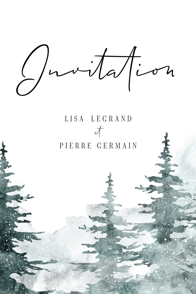 Faire-part de mariage hivernal avec des sapins en aquarelle