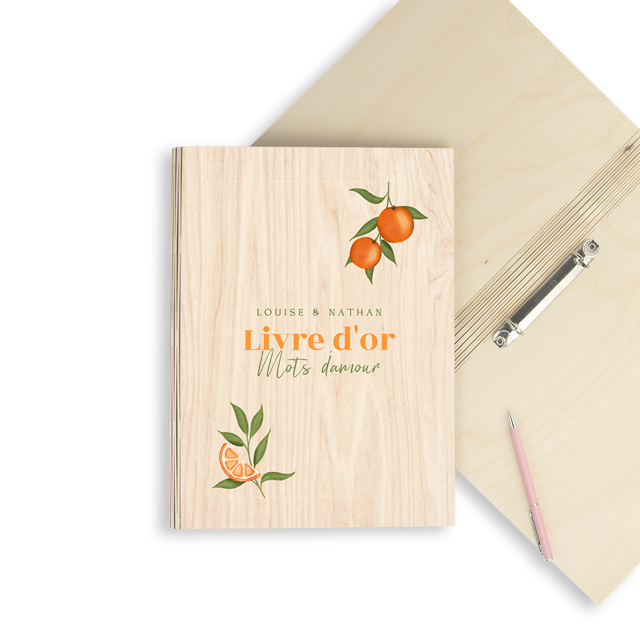 Livre d'or en bois tendance avec branches et oranges