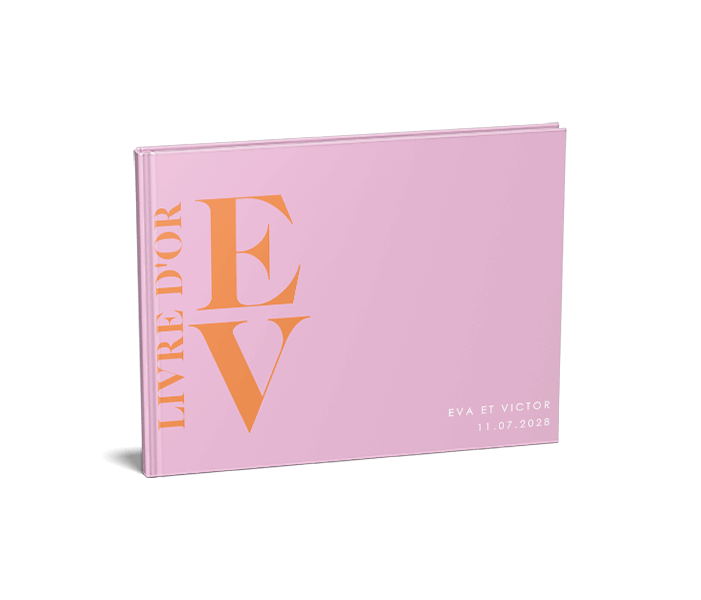 Livre d'or avec initiales des mariés en orange sur fond rose
