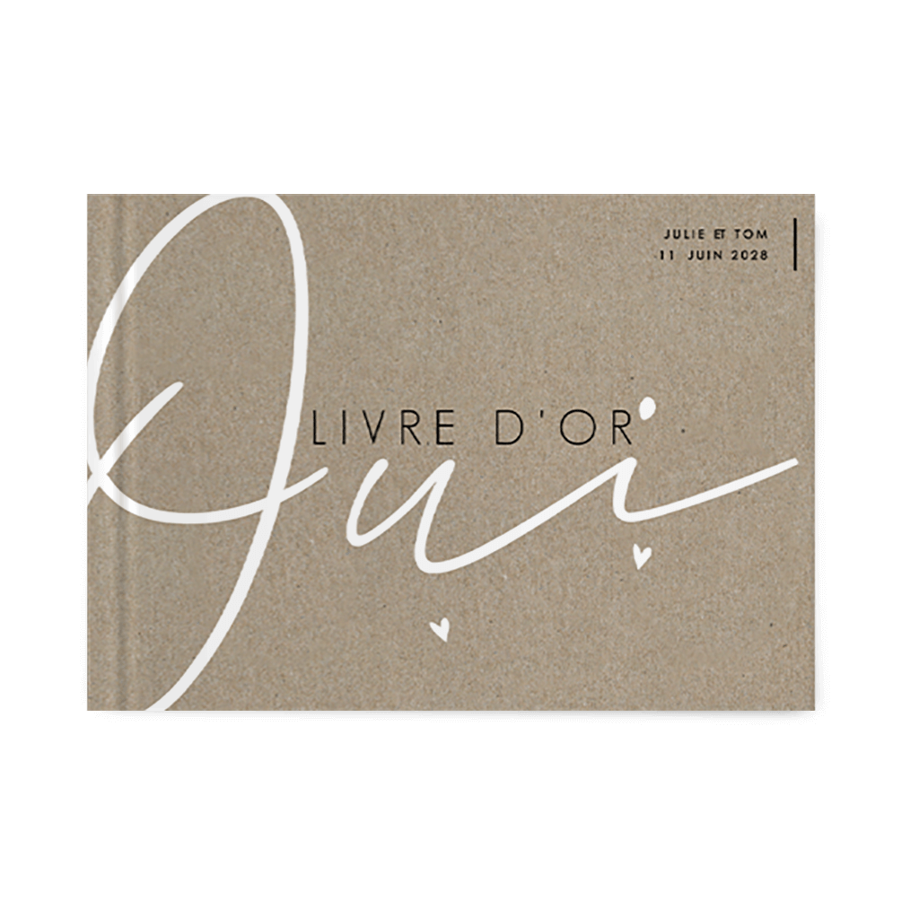 Livre d'or d'aspect kraft avec texte blanc et cœur