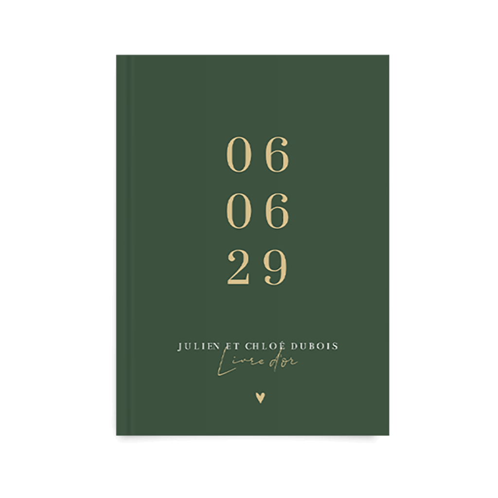 Livre d'or élégant, fond vert foncé, coeur, date, prénoms