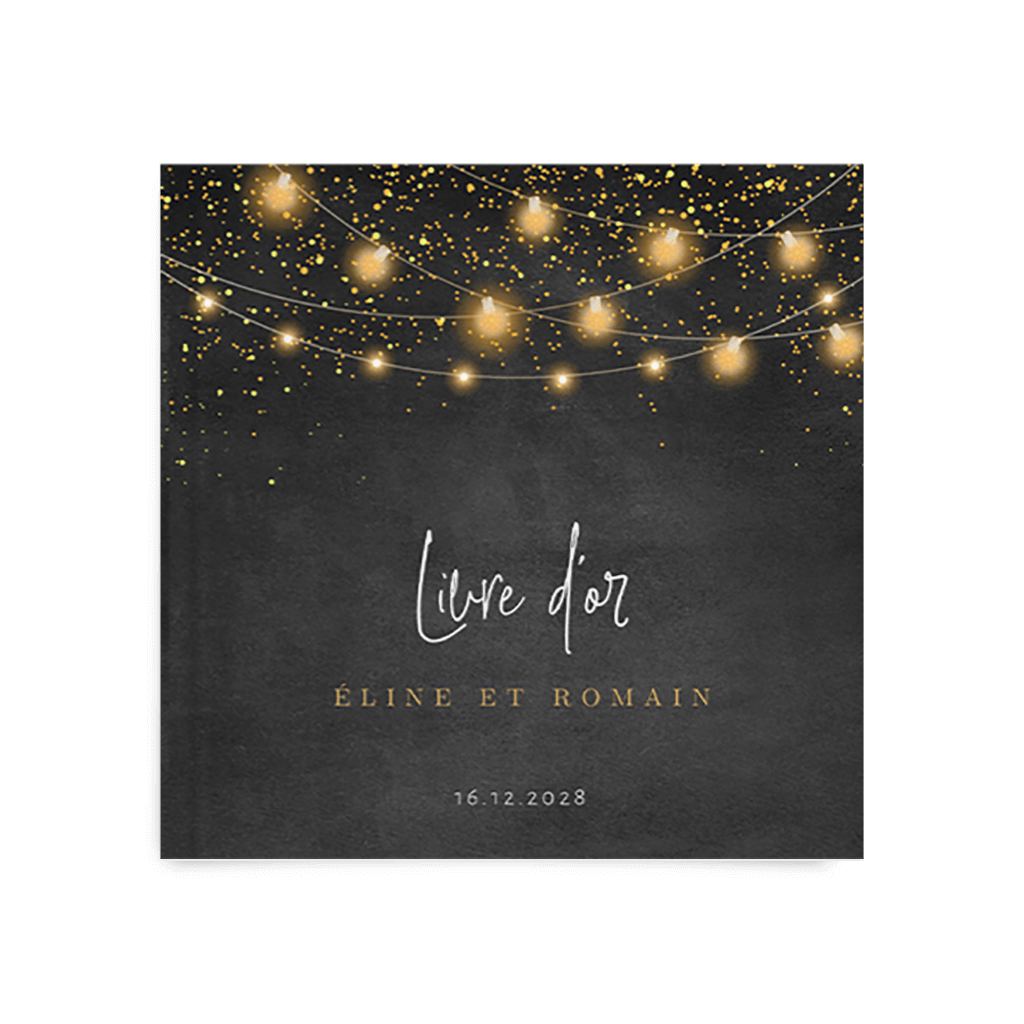 Livre d'or festif avec guirlandes lumineuses et fond de tableau noir
