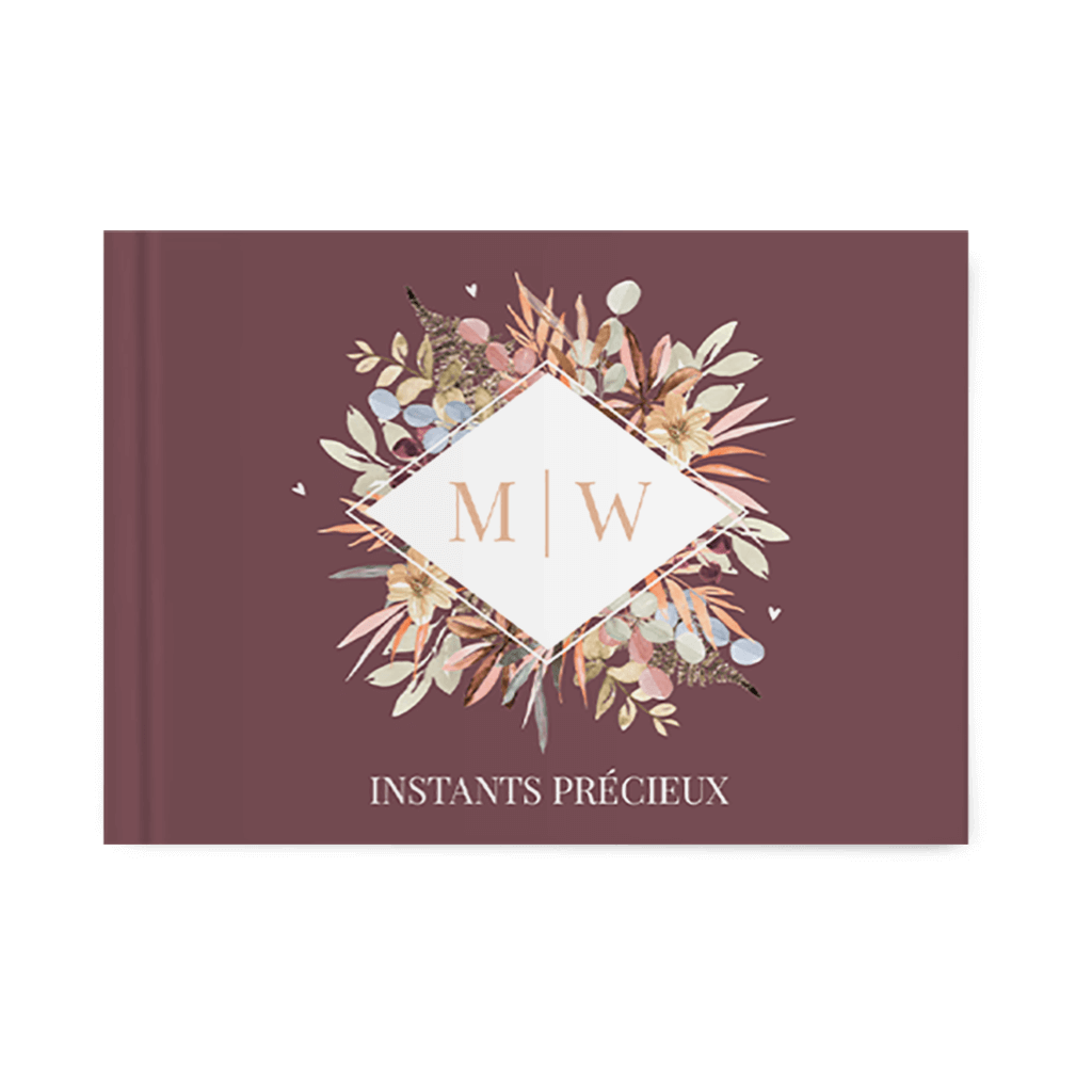 Livre d'or avec feuilles, coeurs et initiales des mariés