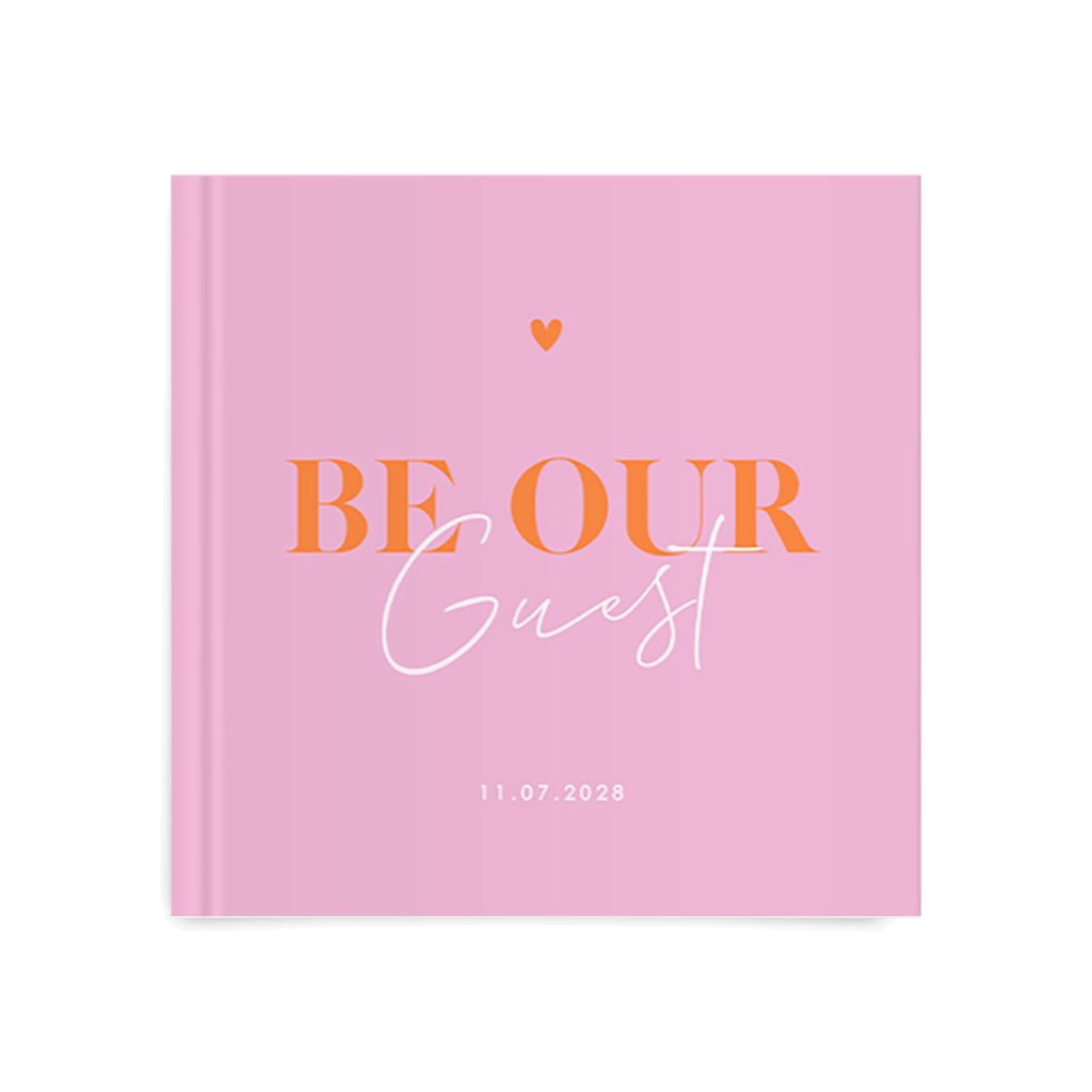 Livre d'or fond rose, texte orange et blanc avec un coeur