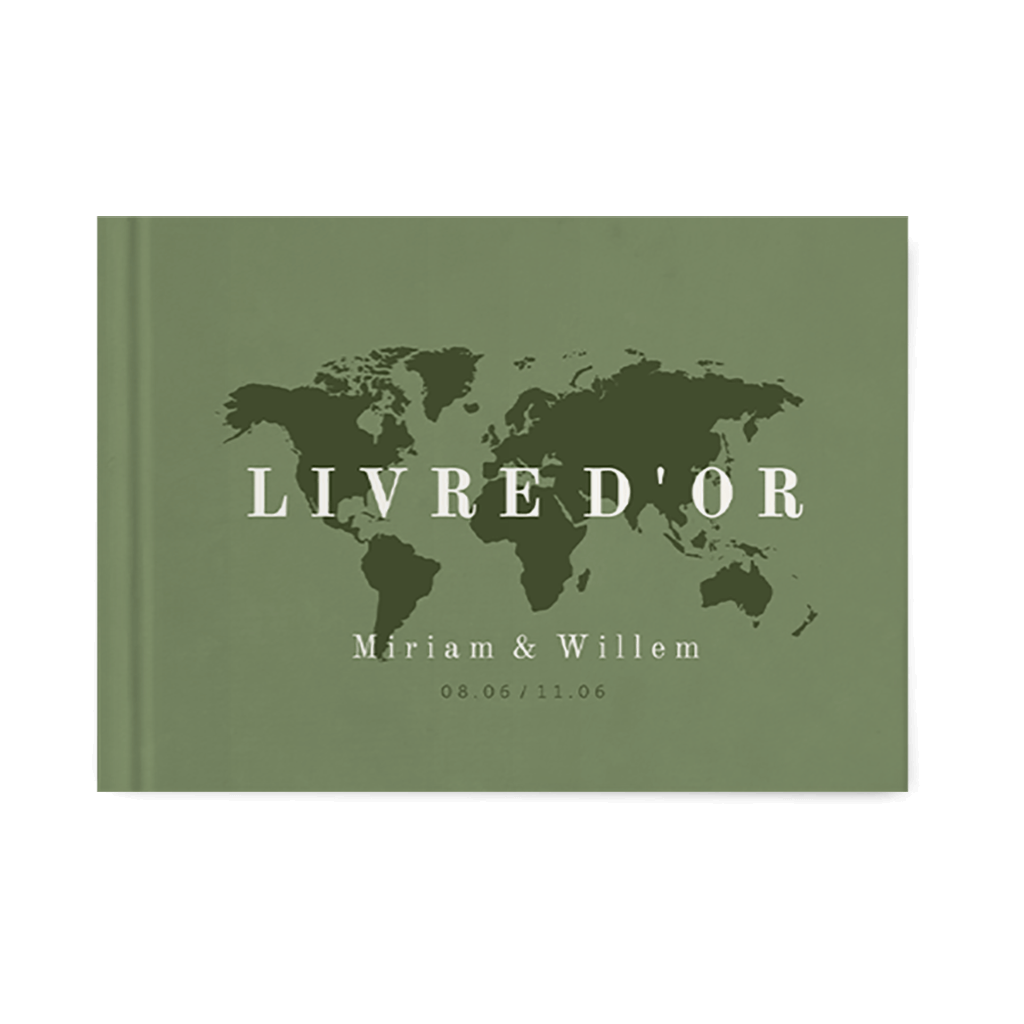 Livre d'or fond vert avec carte du monde, thème voyage