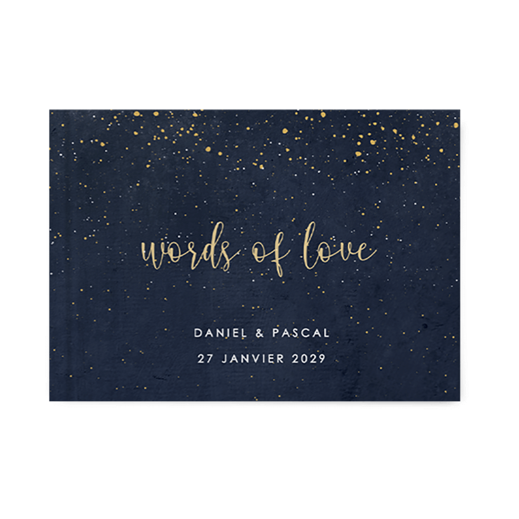 Livre d'or de mariage avec fond bleu nuit et détails jaune doré