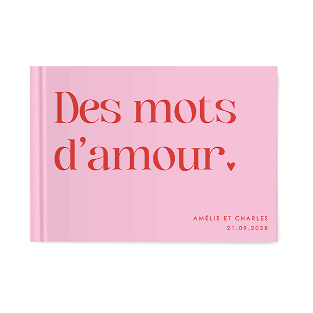 Livre d'or moderne rose avec typographie rouge et cœur