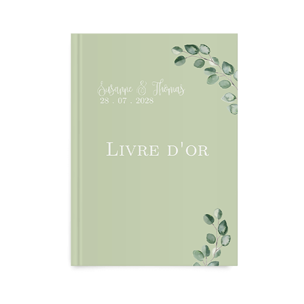 Livre d'or vert avec feuilles et typographie romantique