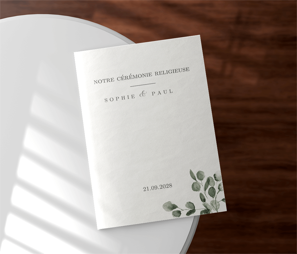 Ce livret de messe est relié par deux agrafes et peut être imprimé soit sur du papier mat (papier sans bois 170g/m²), soit sur du papier lisse légèrement brillant (satiné 170g/m²). Cette version comporte 8 pages ; si vous préférez une version de 12 pages, n’hésitez pas à nous contacter à cet effet.