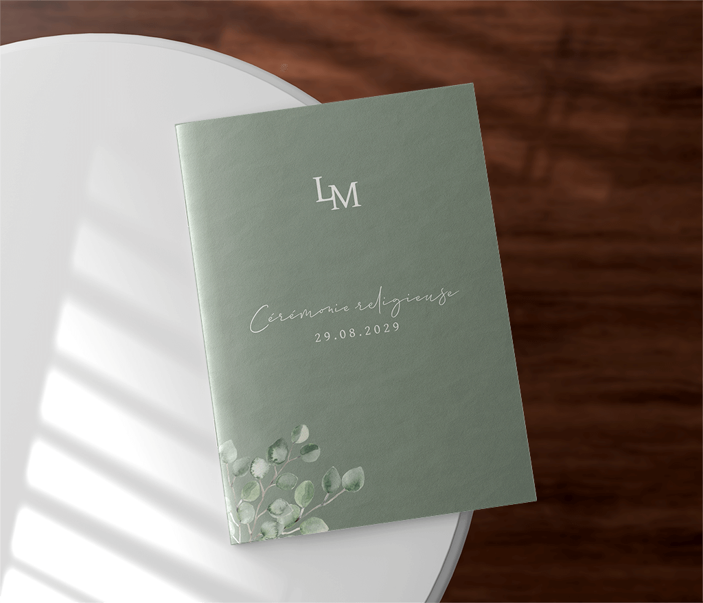 Ce livret de messe est relié par deux agrafes et peut être imprimé soit sur du papier mat (papier sans bois 170g/m²), soit sur du papier lisse légèrement brillant (satiné 170g/m²).