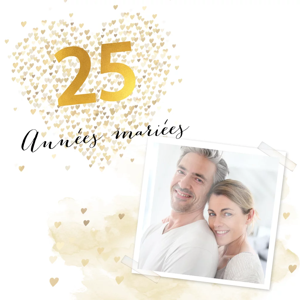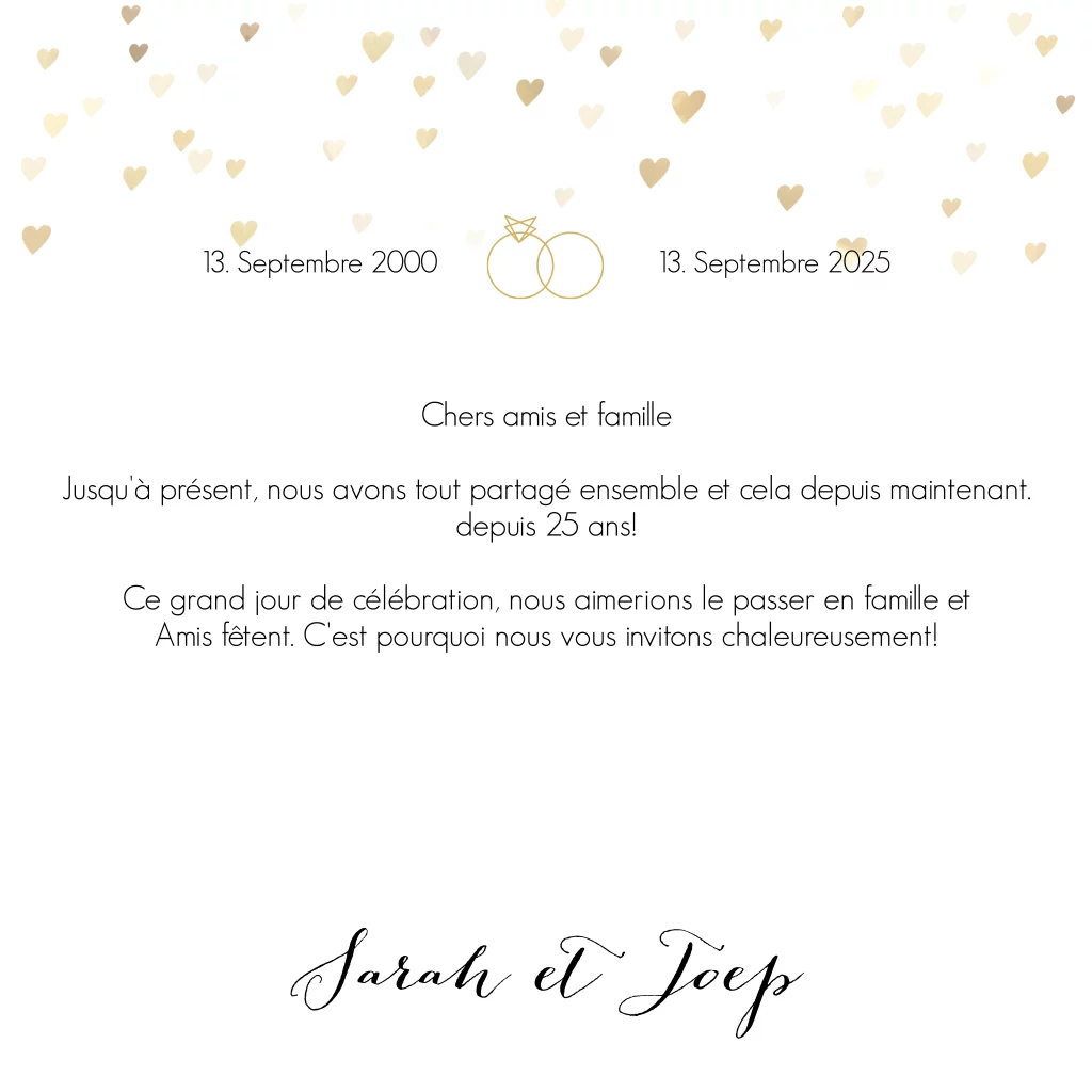 Invitez vos proches à votre anniversaire de mariage en argent avec cette belle carte. De nombreux petits cœurs ainsi qu'un grand 25 doré embellissent efficacement votre texte d'invitation personnalisé.