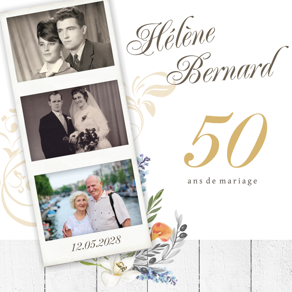 Invitation de noces d'or avec bande de photos et bouquet de fleurs