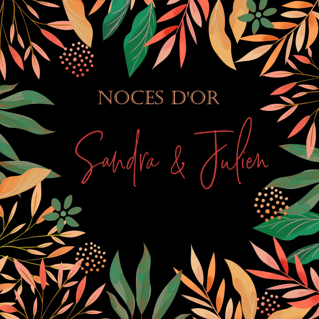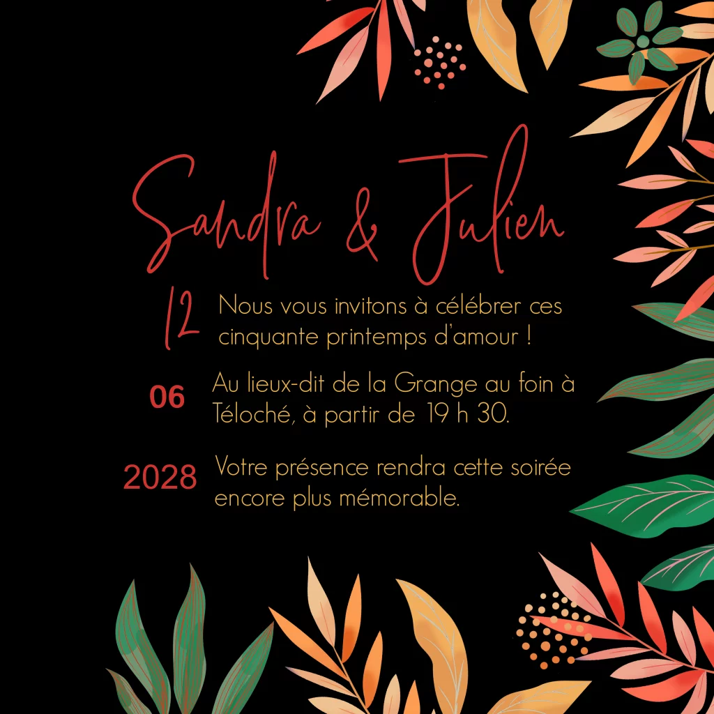 Invitation de noces d'or avec des feuilles et des fleurs oranges.
