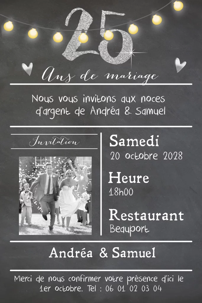 Invitation vintage noces d'argent avec cœurs et guirlande
