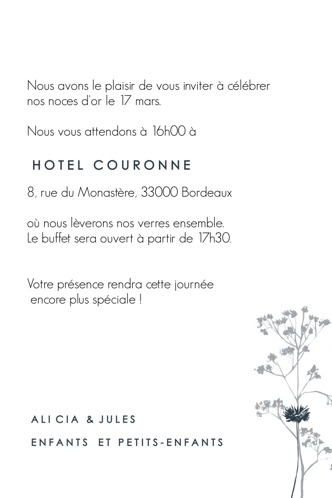 Invitation noces d'or avec fond bleu foncé et dessin de fleurs
