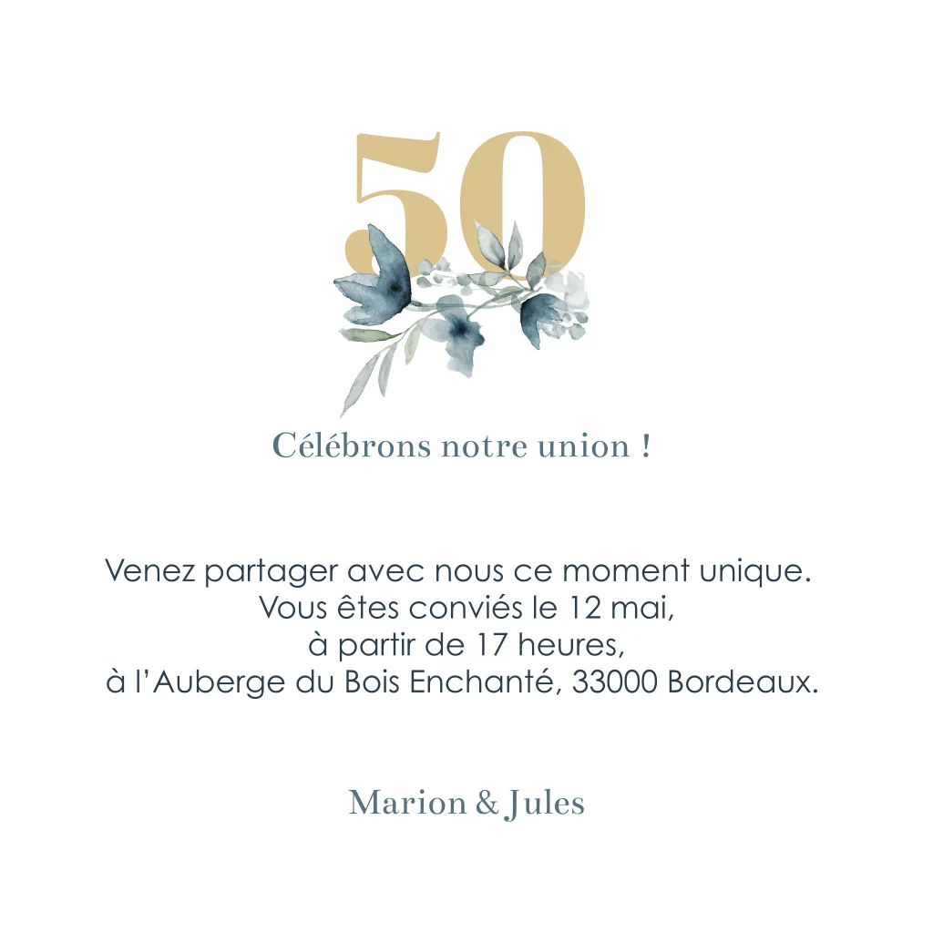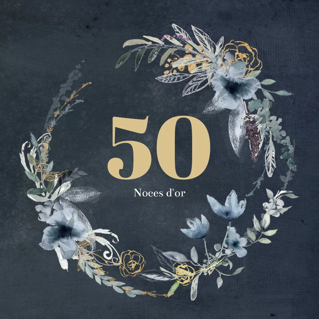 Invitation noces d'or avec fond bleu et couronne de fleurs