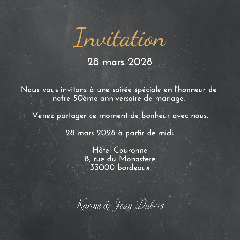 Invitation anniversaire mariage avec photo et coeurs jaune-or