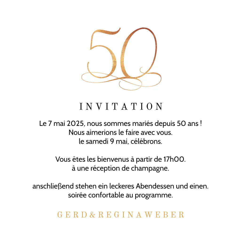 Envoyer une invitation pour les noces d'or avec de l'or étincelant et une photo