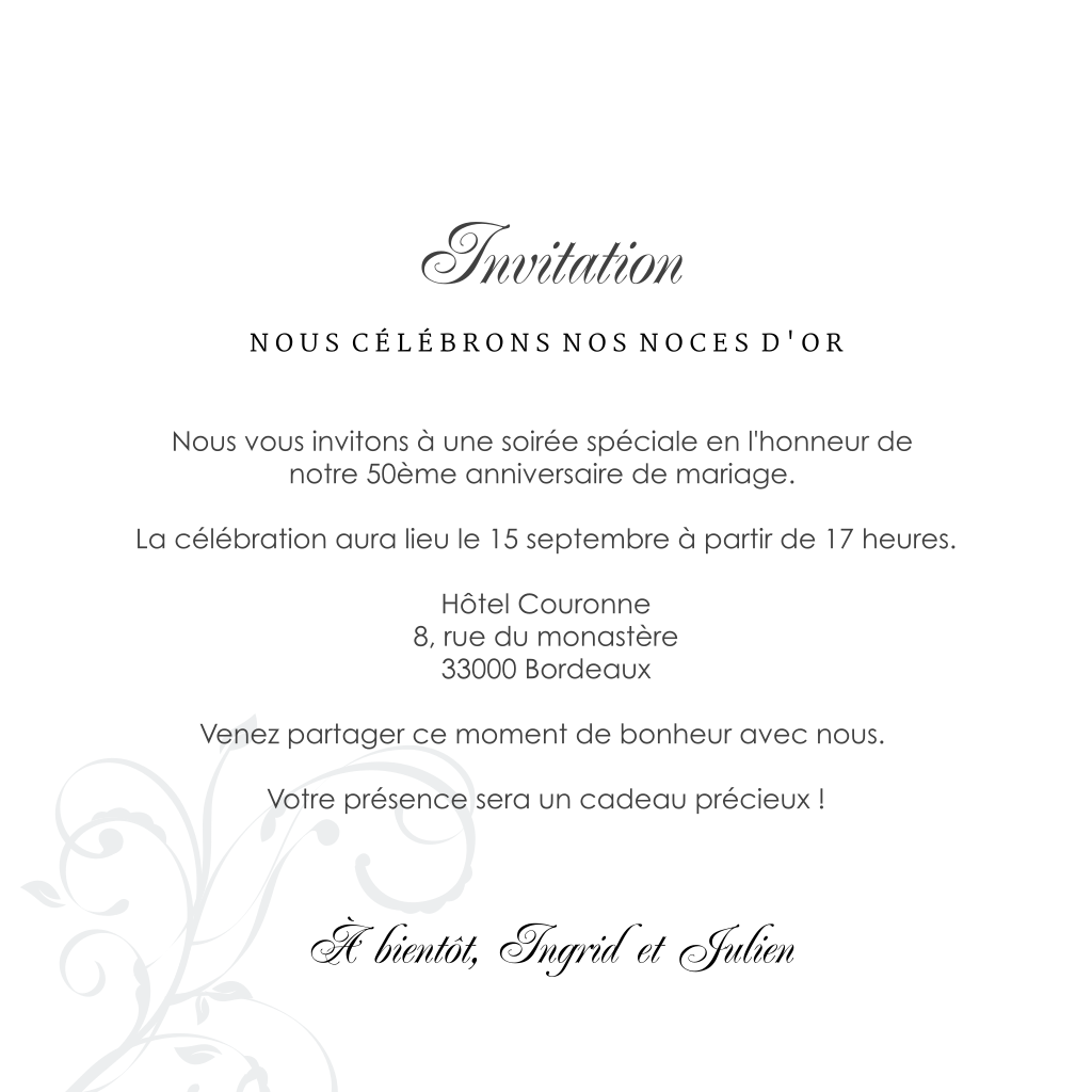 Invitation noces d'or avec photo et dessins gris et jaune-or