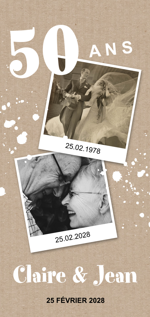 Carte d'invitation pour des noces d'or avec des photos et dorures.