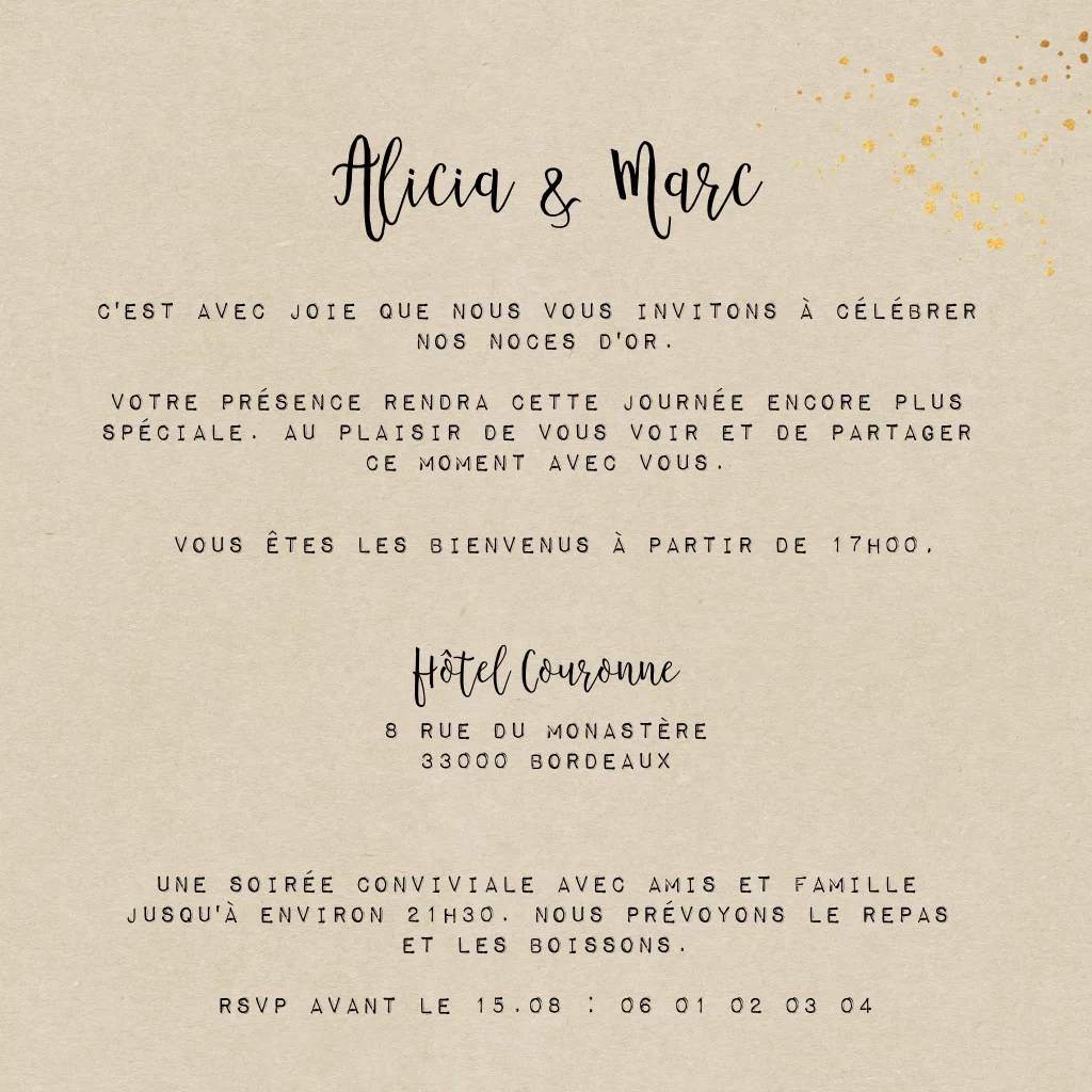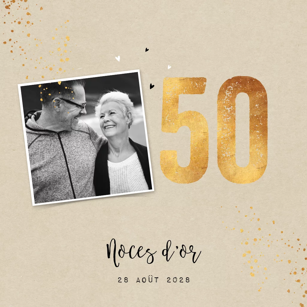 Invitation noces d'or avec photo et détails jaune-or