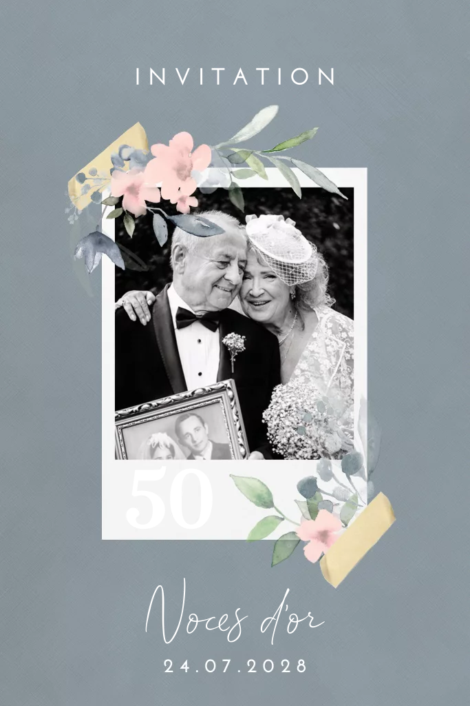 Invitation noces d'or avec fleurs à l'aquarelle et un fond gris