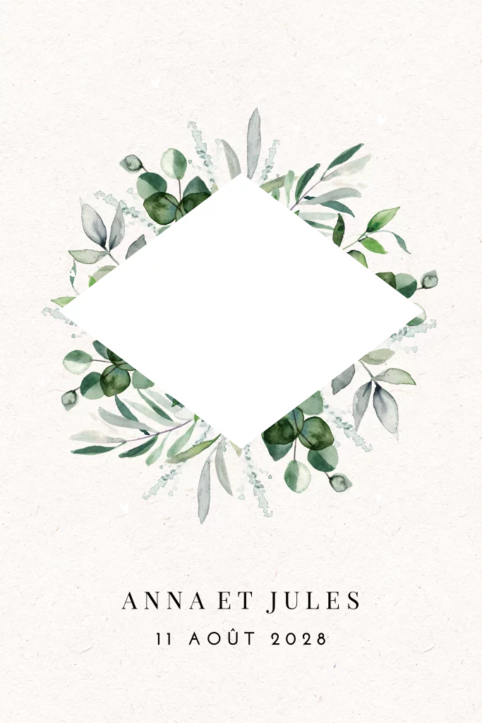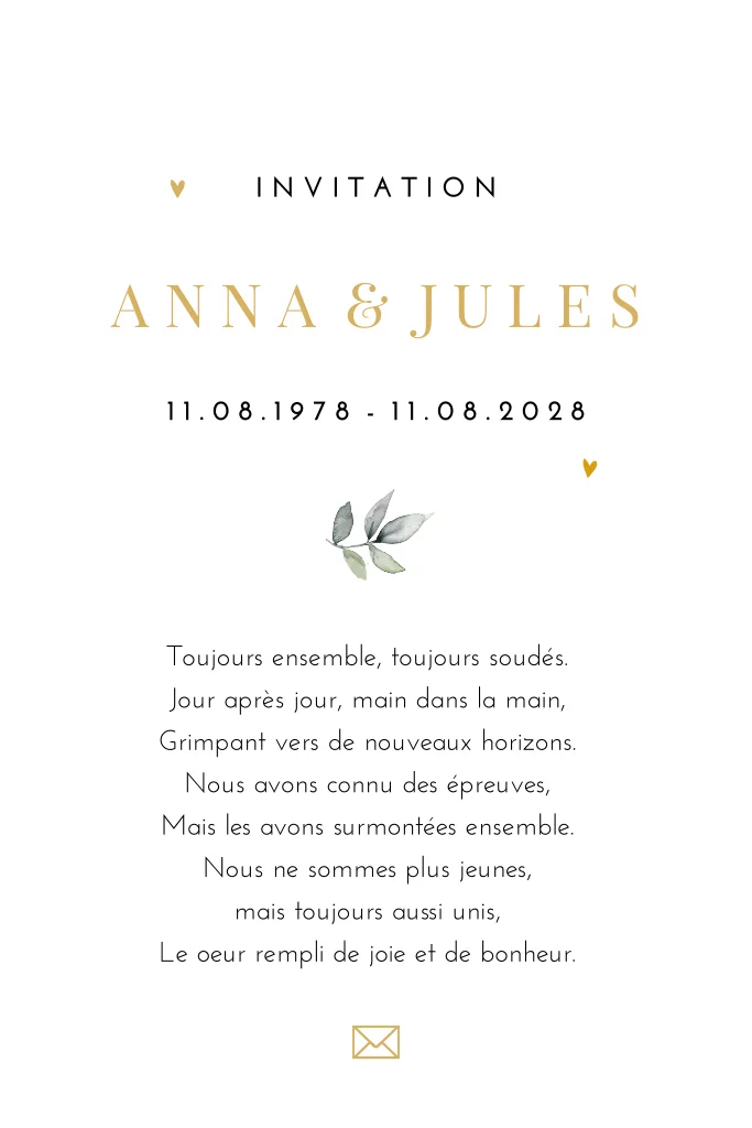Invitation anniversaire mariage avec branches vertes et coeurs dorés