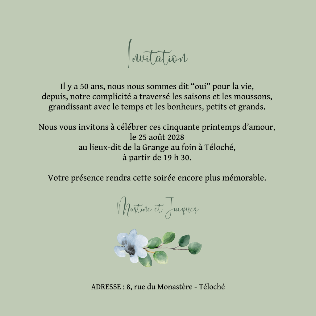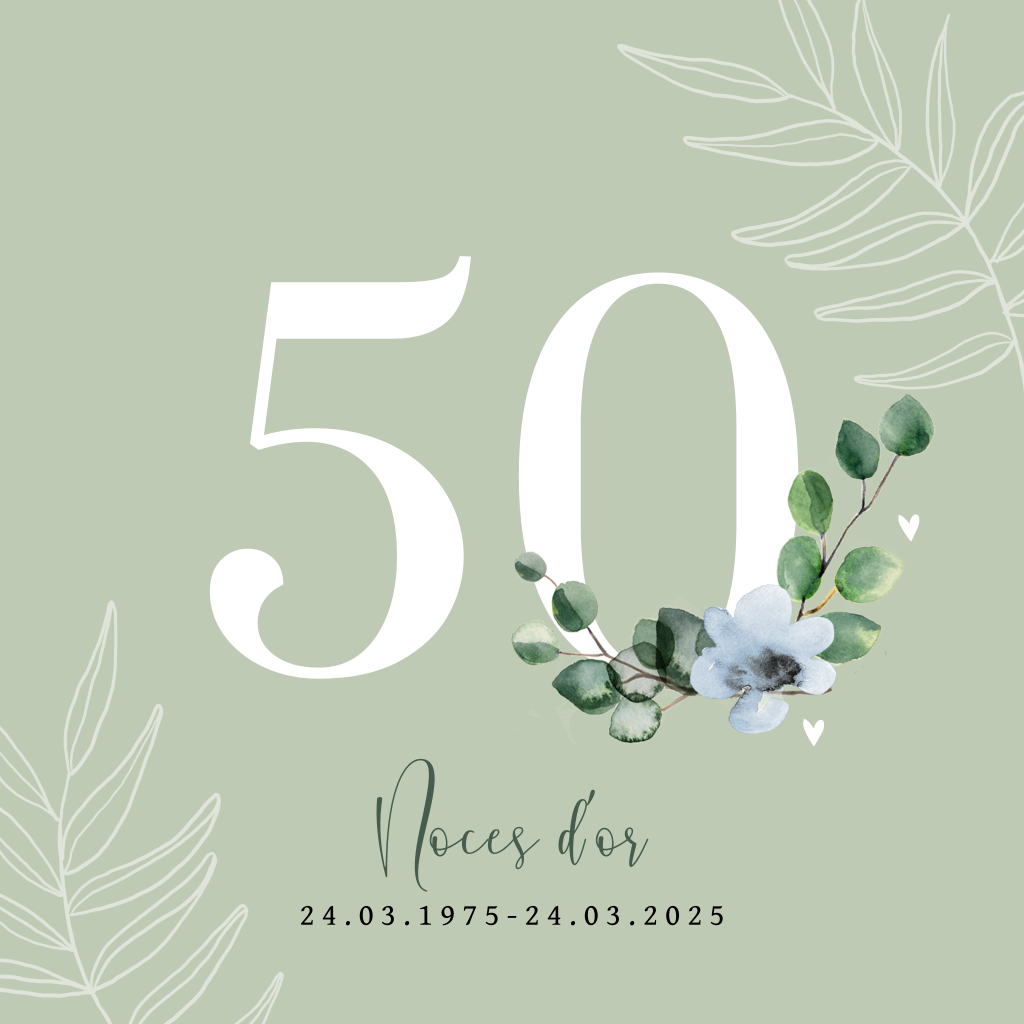 Invitation de mariage pour noces d'or avec 50 sur fond vert menthe