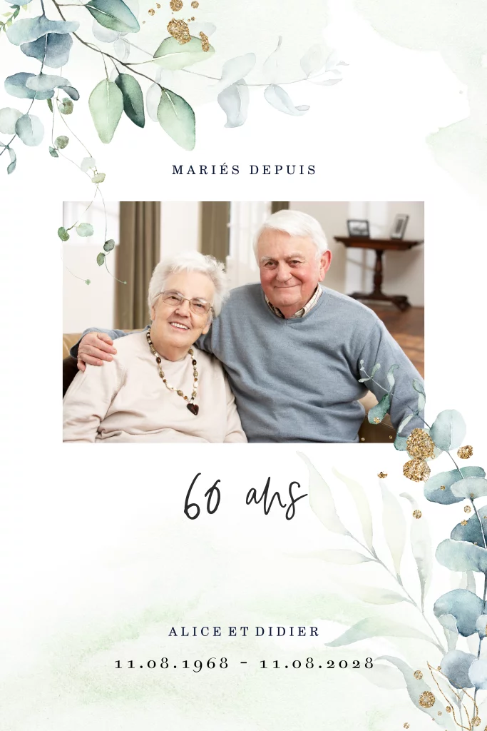 Invitation noces de diamant avec feuillage et photo