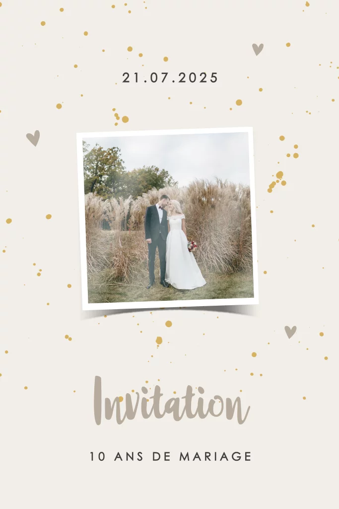 Invitation 10ème anniversaire de mariage avec polaroid et cœurs