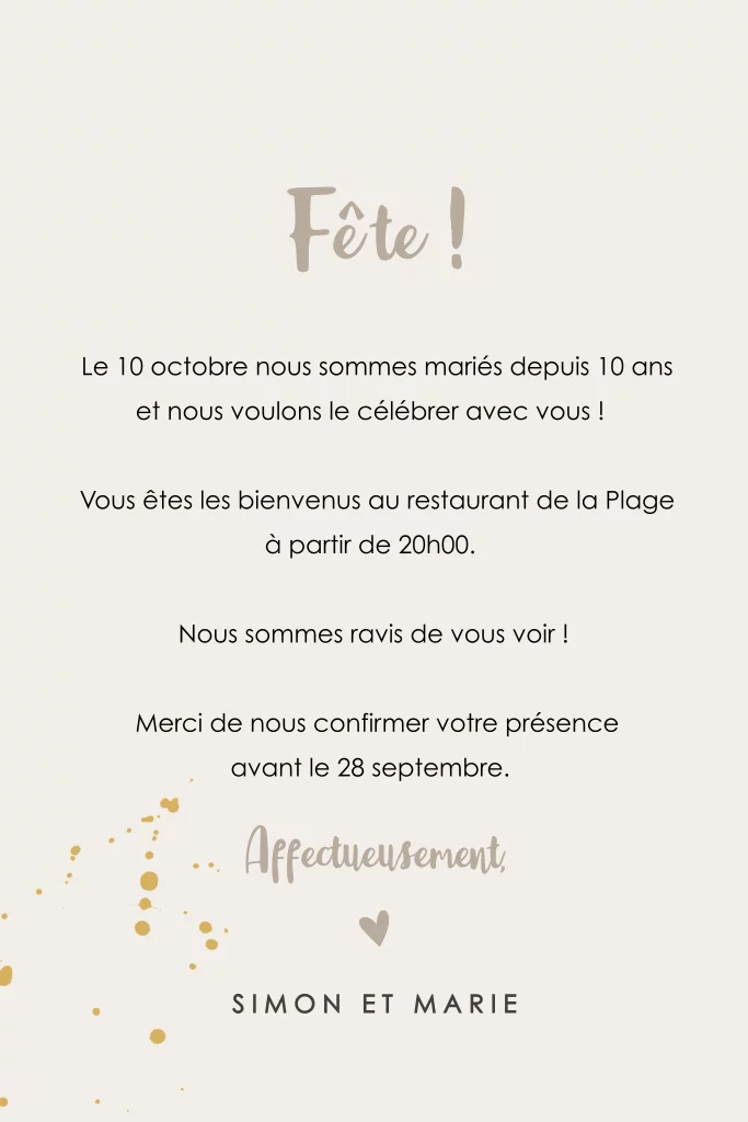 Invitation 10ème anniversaire de mariage avec polaroid et cœurs sur fond beige.