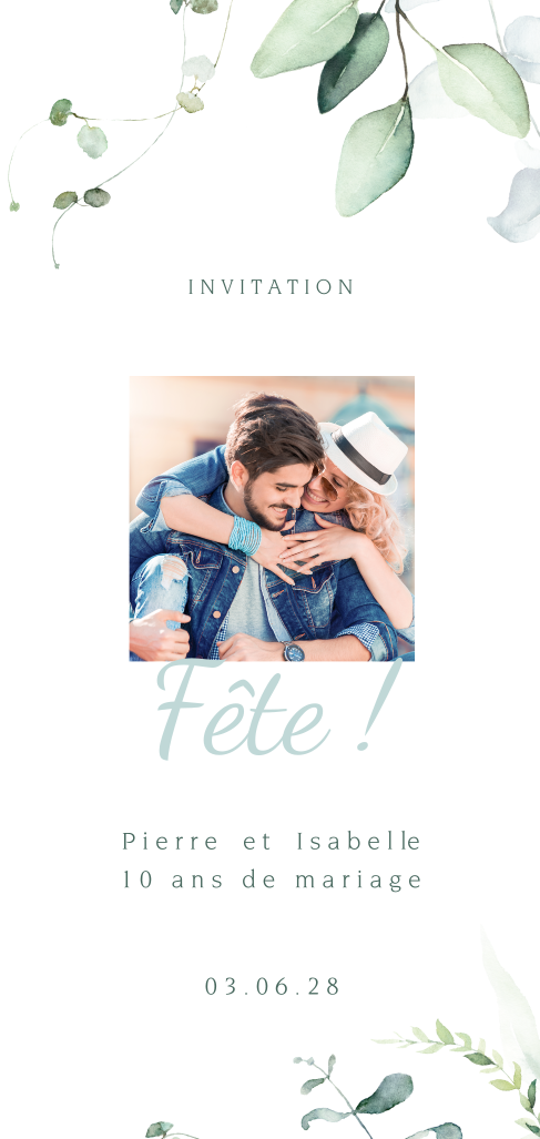 Invitation anniversaire mariage avec photo et branches d'eucalyptus