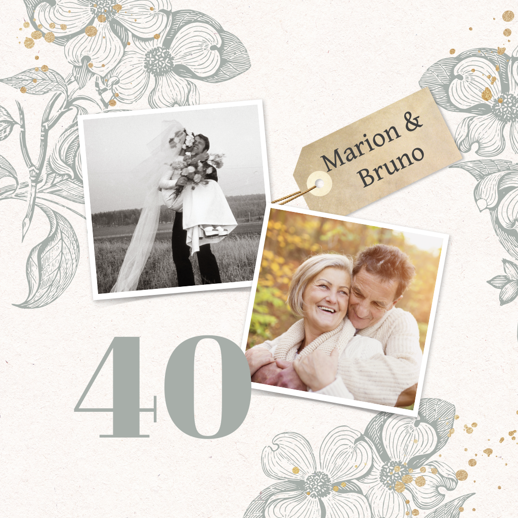 Invitation pour les noces d'émeraude avec dessins de fleurs et photos.