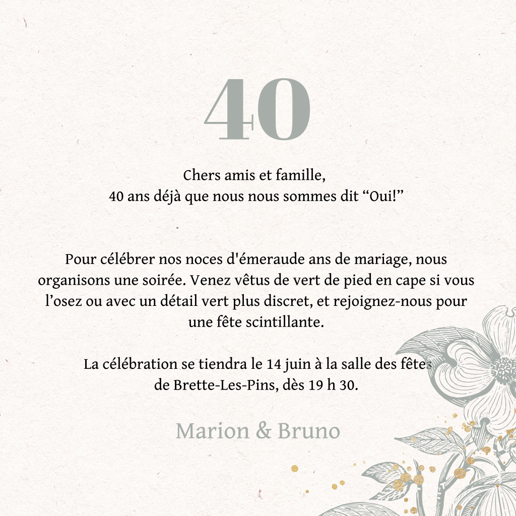 Invitation pour les noces d'émeraude avec dessins de fleurs