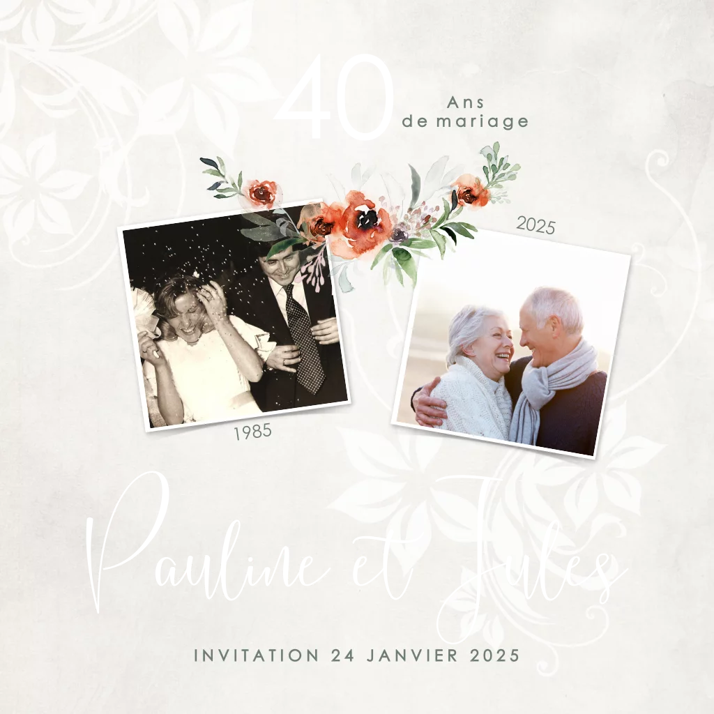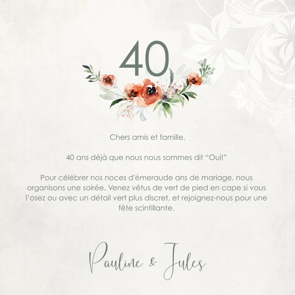 Invitation pour les noces d'émeraude avec photos, fleurs et dorure