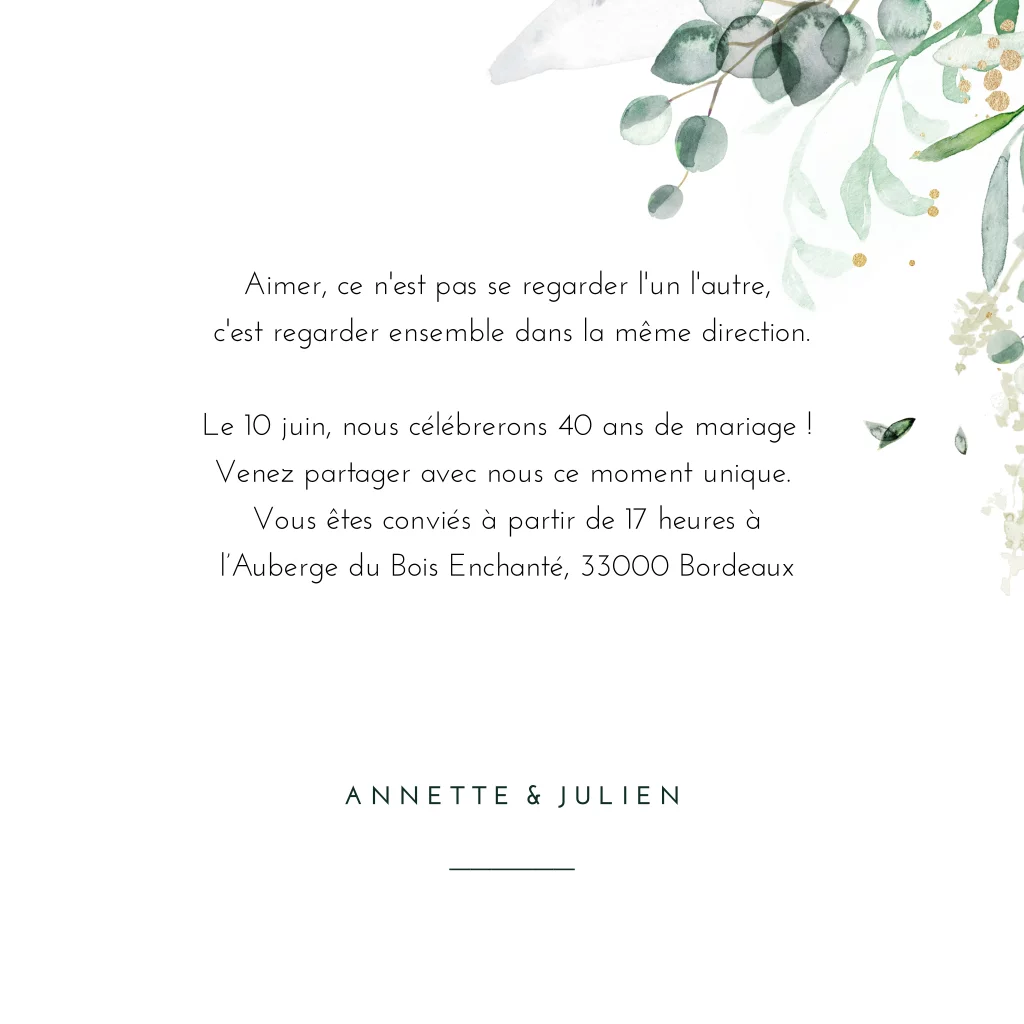 Invitation anniversaire mariage avec branches à l'aquarelle et cœurs
