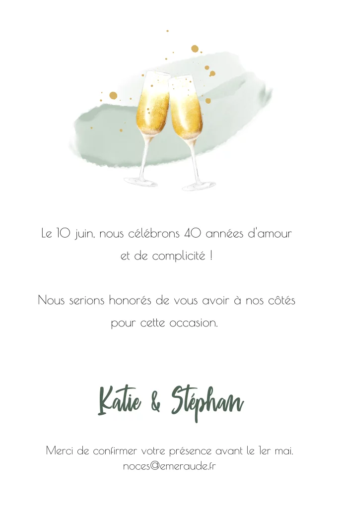 Invitation noces d'emeraude avec verres à champagne et peinture aquarelle verte