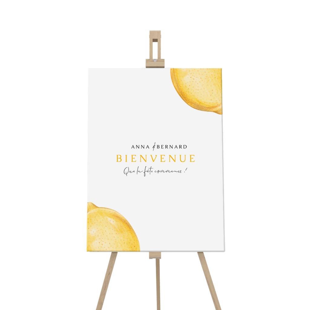 Panneau de bienvenue avec citrons, texte jaune et noir