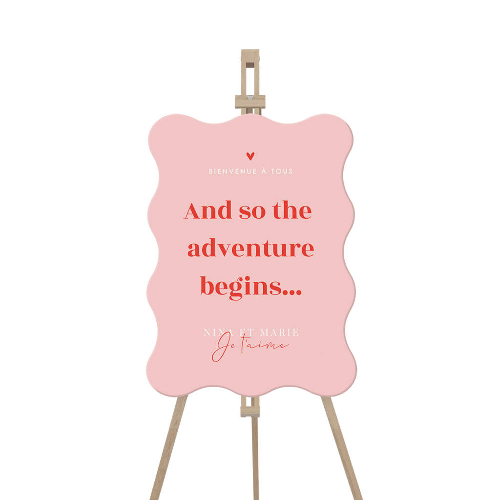 Panneau de bienvenue, forme originale, fond rose et écriture rouge