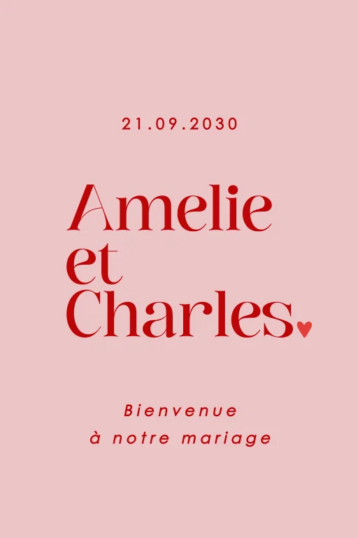 Panneau de bienvenue mariage avec texte et cœur rouge sur fond rose