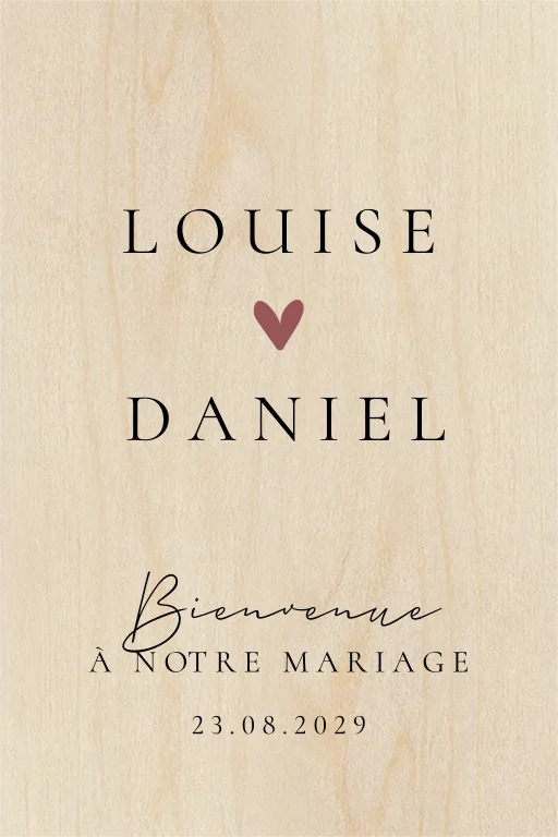 Panneau de bienvenue avec message, prénoms et coeur