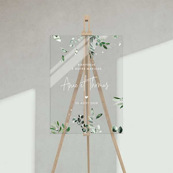Panneau de bienvenue en plexiglas avec des branches vertes