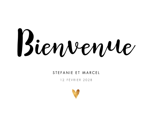 Panneau de bienvenue avec un texte noir sur un fond blanc et un cœur