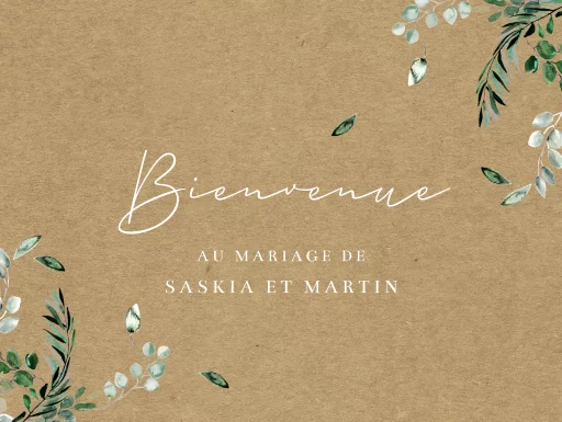 Panneau de bienvenue en carton avec eucalyptus sur aspect kraft