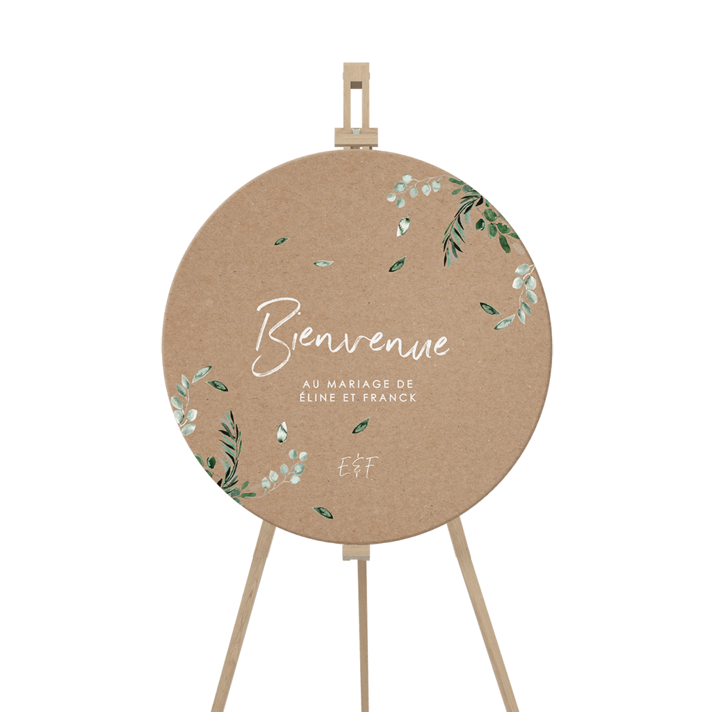 Panneau de bienvenue avec un fond kraft et des feuilles d'eucalyptus