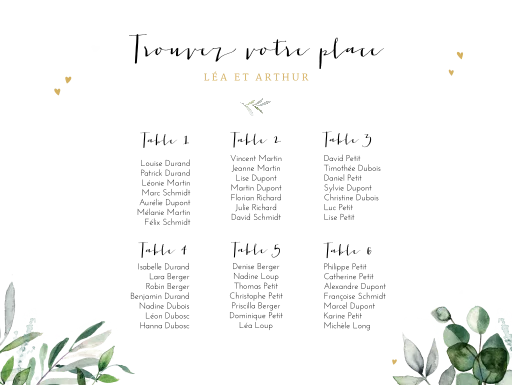 Panneau plan de table sur le thème eucalyptus avec des coeurs