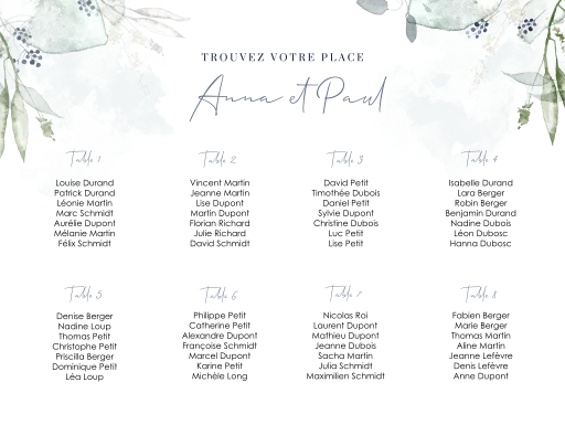 Plan de table avec des branches d'aquarelle en bleu et vert