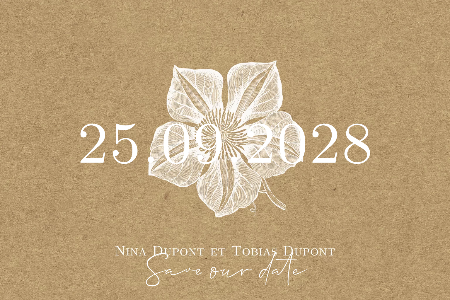 Save the date avec des fleurs blanches et des détails dorés
