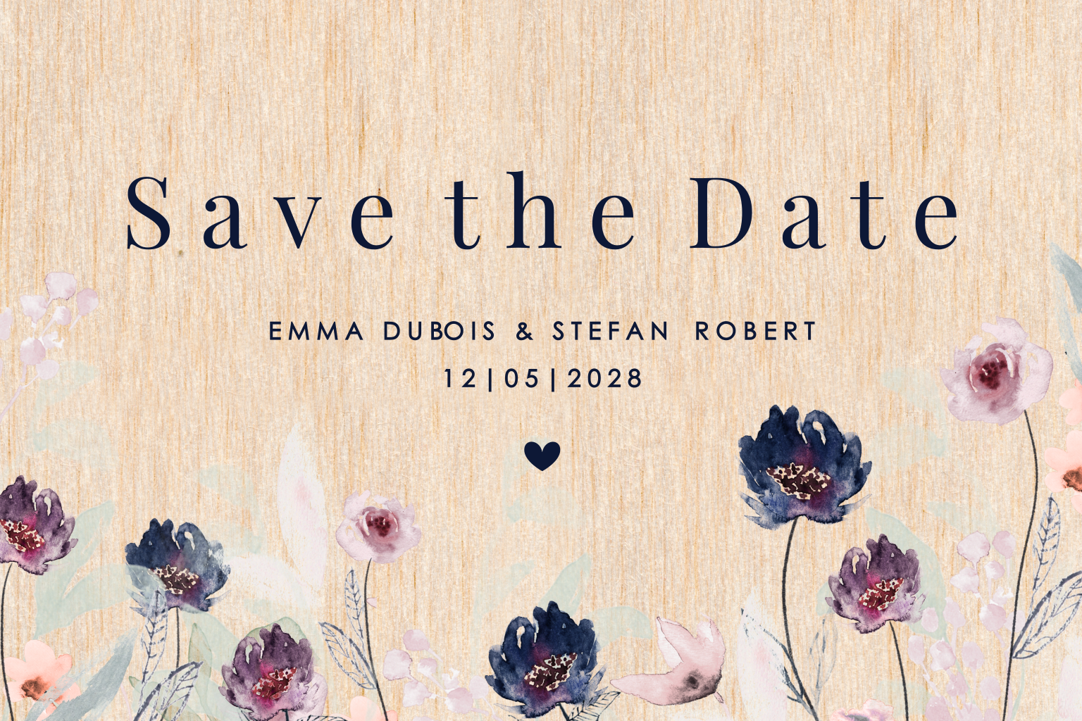 Save the date élégante en bois avec des fleurs à l'aquarelle