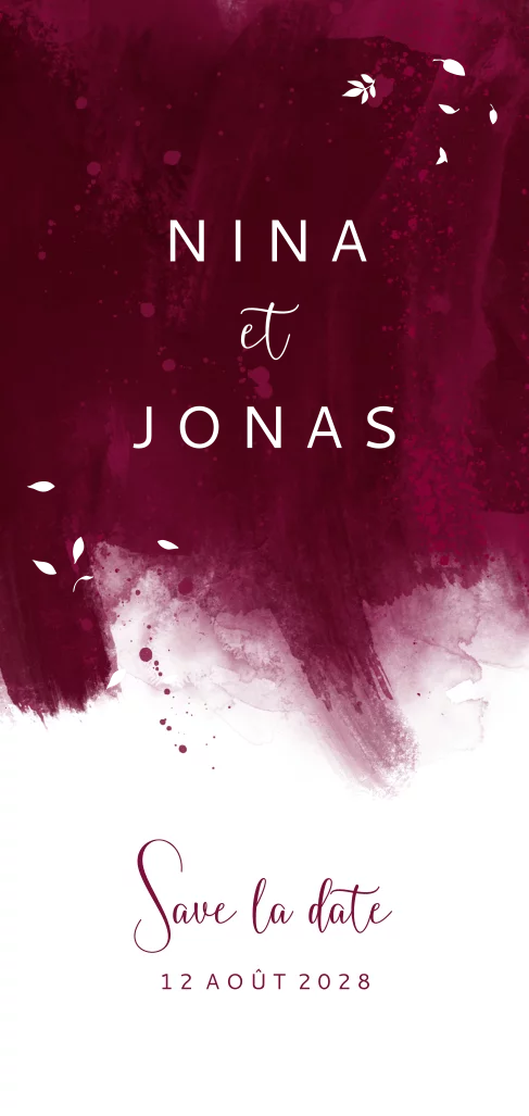 Save the date avec des traits de pinceau pourpres et et des dorures.